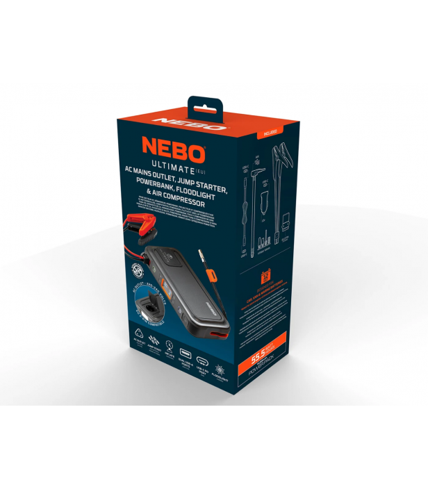 Le NEBO ULTIMATE est un appareil multifonction complet réunissant quatre équipements indispensables en un seul bloc compact : powerbank haute capacité, booster de démarrage 12 V, compresseur d’air numérique et prise secteur 230 V. Idéal pour la voiture, le camping, la route ou les situations d’urgence, il garantit autonomie et sécurité, où que vous soyez.