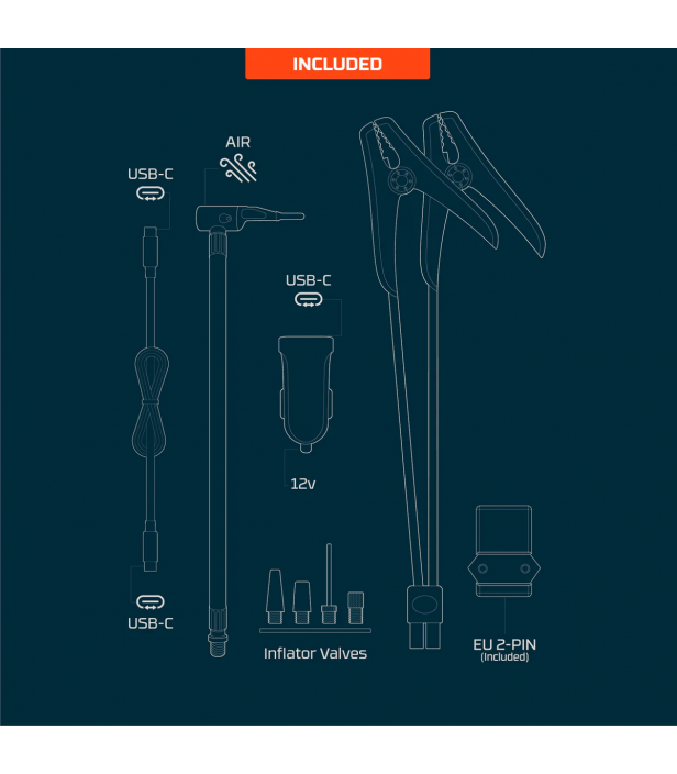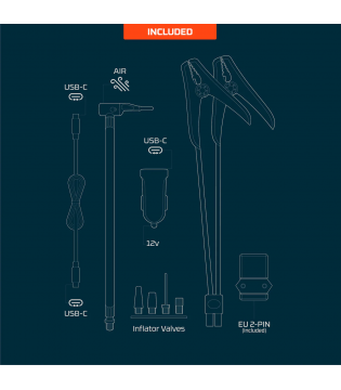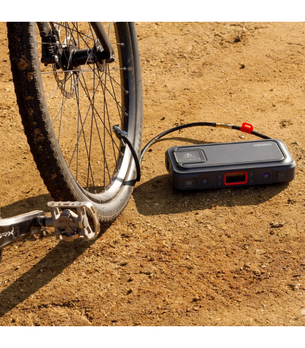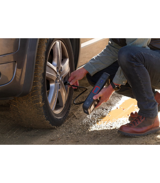 Le compresseur intégré permet de gonfler pneus, ballons, matériel de camping ou équipements sportifs avec précision. Idéal pour la route, le garage ou les loisirs extérieurs.