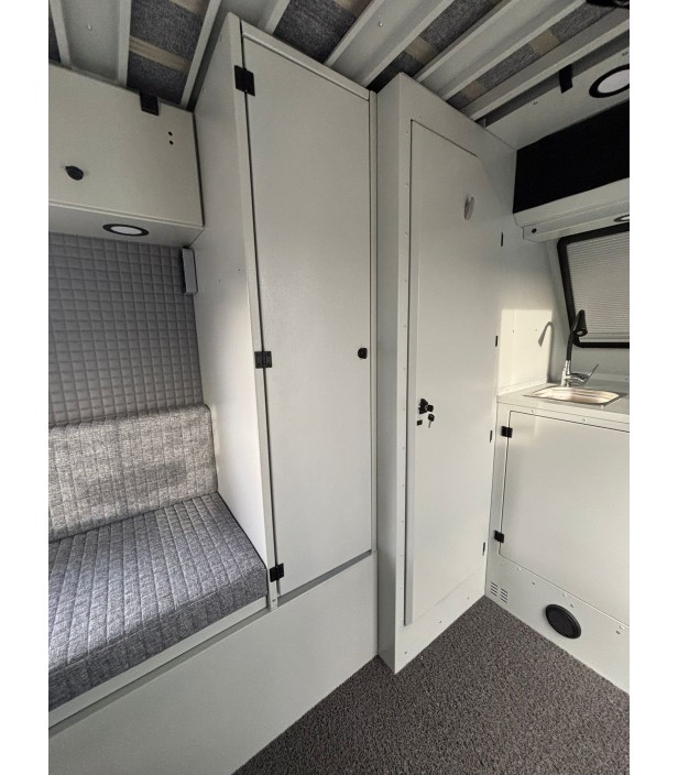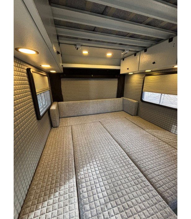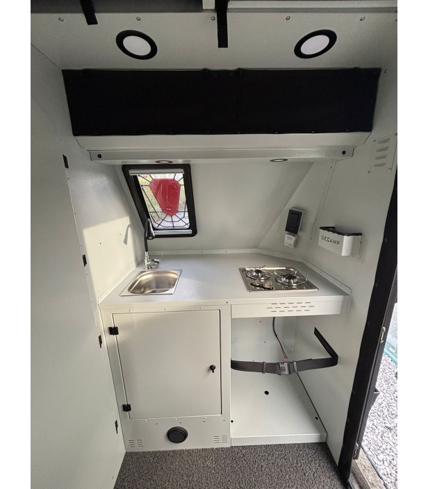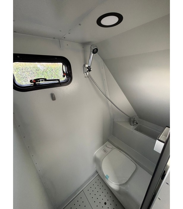 Cette version 2026 bénéficie d’un niveau d’autonomie exceptionnel : installation solaire avec batterie gel 200 Ah, convertisseur 1000W, Combi Diesel Eberspacher chauffage + chauffe-eau, réservoir eau grise 75L, frigo 100L, cuisine extérieure sur tiroir coulissant et WC cassette Thetford. Elle est prête pour les séjours prolongés en totale indépendance.