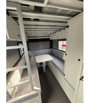 Grâce à sa cellule plus longue, l’espace salon gagne en volume et en confort. La grande table amovible permet de réunir toute la famille dans un espace lumineux, avant de se transformer en vaste couchage inférieur XXL. Le lit supplémentaire à l'étage installé sur ce modèle permet d’augmenter encore la capacité de couchage.