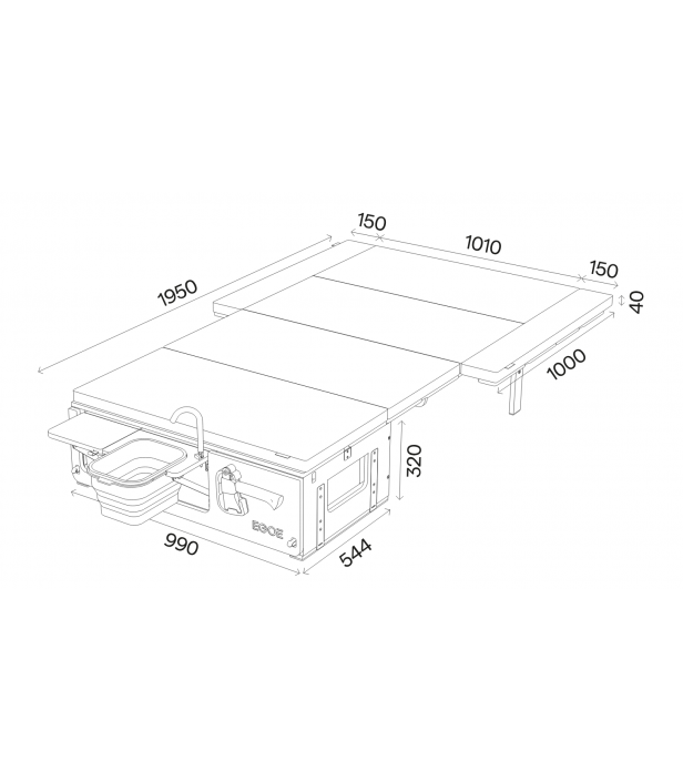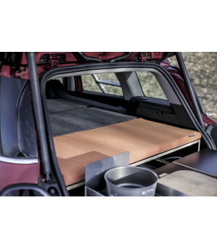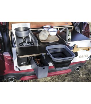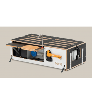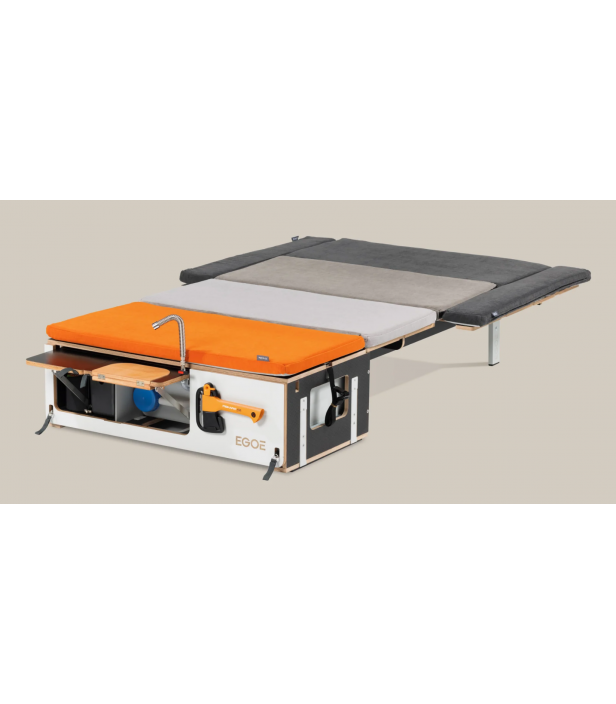 Composée d’un sleeping set et d’un kitchen set, elle intègre un lit (127 x 187 cm), un module eau avec pompe 12V et un espace cuisson double brûleur. Installation rapide, sans modification du véhicule.