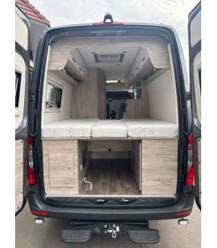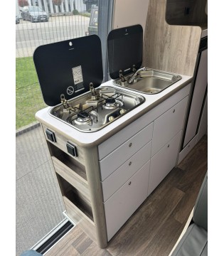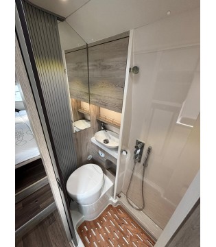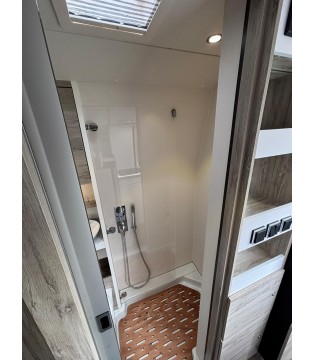L'espace de vie offre le confort d'un salon et se révèle multifonctionnel grâce à son canapé et sa table à manger. La kitchenette, accessible de tous côtés, est entièrement équipée pour vos créations culinaires. Le spacieux espace nuit est idéal pour se reposer et se détendre devant la télévision ou un livre. Sous le lit se trouve un généreux espace de rangement accessible de l'extérieur comme de l'intérieur. L'élégante salle de bain est dotée d'une cabine de douche et de toilettes Thetford pivotantes. Un espace suffisant au-dessus du lavabo permet de ranger vos effets personnels.