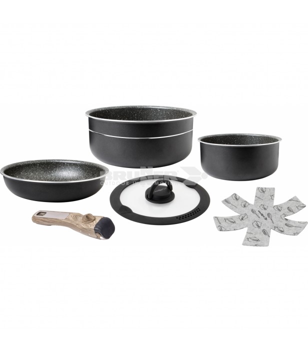 Le set de casseroles BRUNNER Pirate Spacemaster est une solution compacte et haut de gamme pour cuisiner facilement en camping, en van ou en bivouac. Fabriqué en aluminium 100 % recyclé avec revêtement antiadhésif sans PFOA, il permet un gain de place maximal une fois empilé, sans compromis sur la qualité de cuisson.