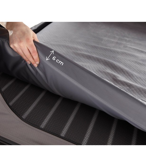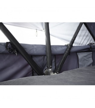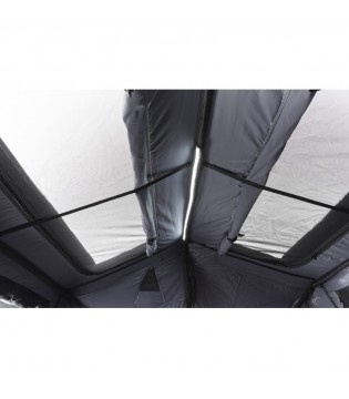 L’annexe incluse permet de créer un espace fermé et protégé directement au sol, avec un plancher amovible et des ouvertures sur les quatre côtés équipées de moustiquaires. Elle est réglable en hauteur pour s’adapter au véhicule et offre un espace intérieur d’environ 240 x 260 cm.