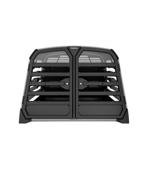Comme les autres modèles Allax, la version Double est crash-testée au Thule Test Center et certifiée TÜV-SÜD. Elle intègre une zone de déformation qui contribue à une protection supérieure en cas d’impact. Le confort au quotidien est renforcé par une porte à amortisseur à gaz (ouverture/fermeture douces), une serrure intégrée, des bords arrondis et un design silencieux conçu pour éviter les bruits et cliquetis. La profondeur réglable permet d’optimiser l’installation dans le coffre, et des sangles de tension aident à maintenir la cage stable pendant la conduite.