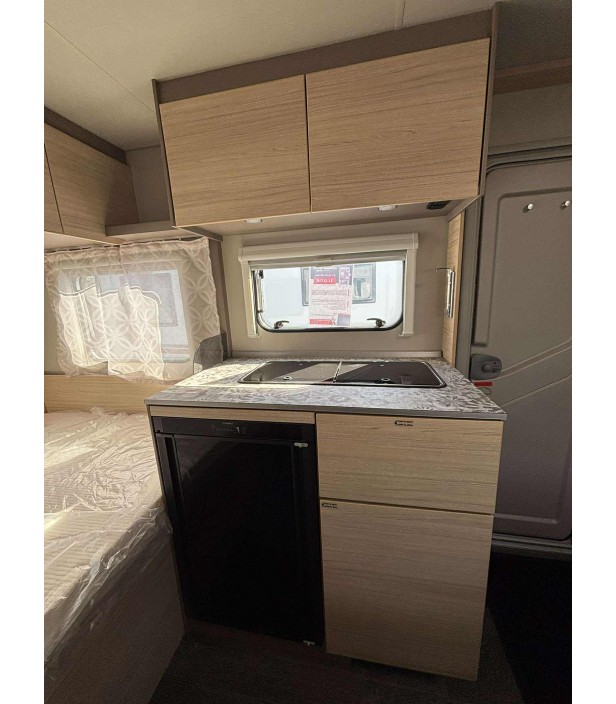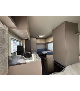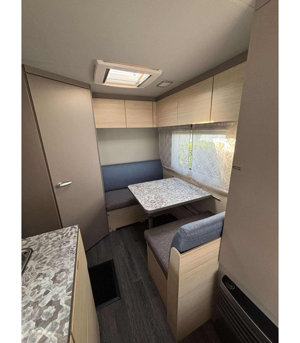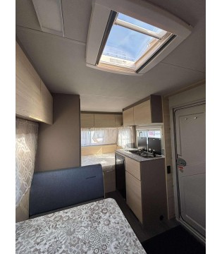 Une superbe caravane compacte avec lits superposés transversal et banquette transformable en lit king size.