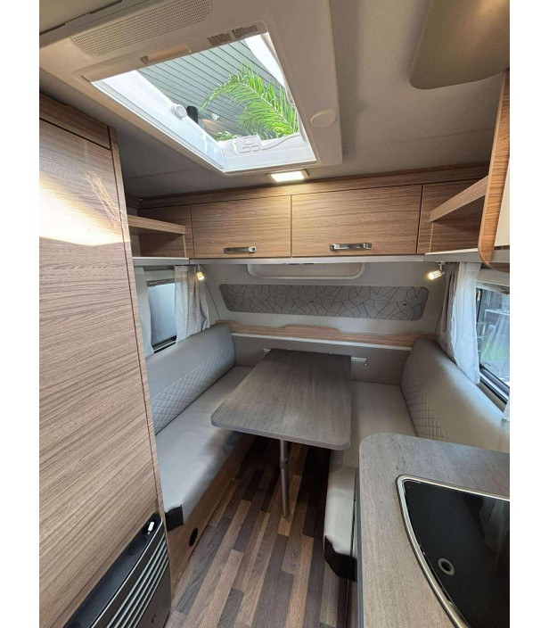 Superbe caravane familiale avec banquette transversale et trois lits superposés.