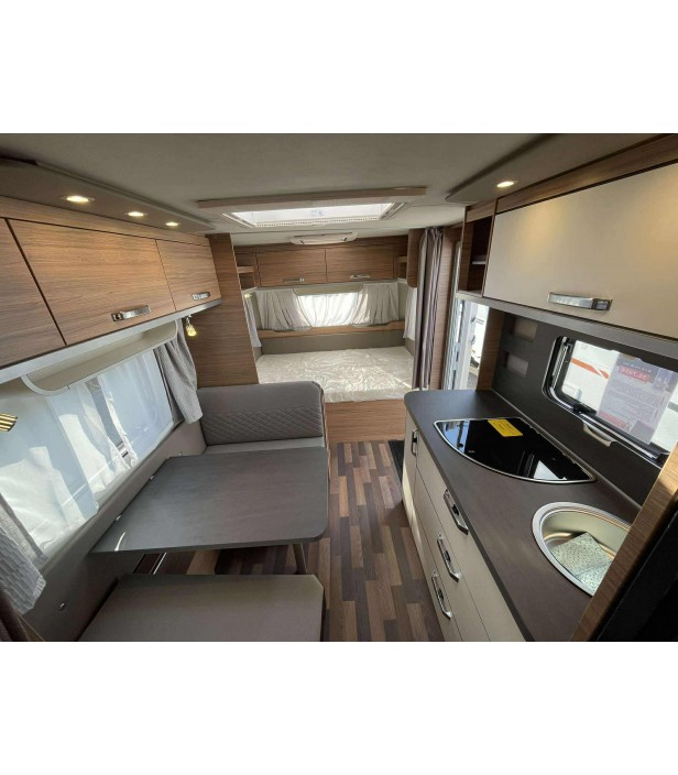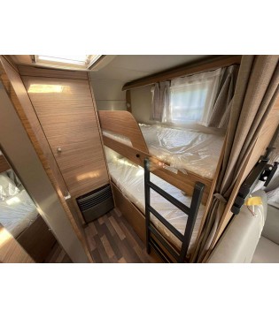 Superbe caravane familiale avec banquette transversale et trois lits superposés.